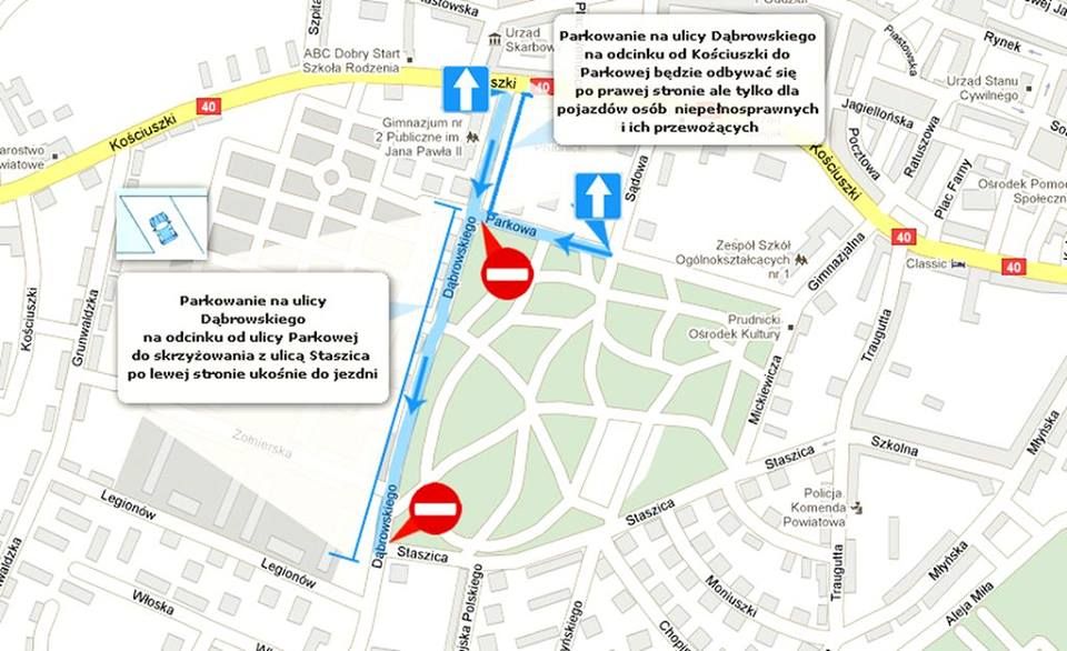 Odcinek ul. Dąbrowskiego od skrzyżowania z ul. Kościuszki do skrzyżowania z ul. Staszica będzie ulicą o jednym kierunku jazdy. Parkowanie możliwe będzie na tym odcinku: od skrzyżowania z ul. Kościuszki do skrzyżowania z ul. Parkową po lewej stronie, jak dotychczas, natomiast po prawej stronie jezdni parkowanie będzie dopuszczone tylko dla pojazdów osób niepełnosprawnych. Natomiast od skrzyżowania z ul. Parkową do ul. Staszica po lewej stronie jezdni, ukośnie do jej osi dopuszczone będzie parkowanie pozostałych pojazdów. Dwukierunkowa ulica Parkowa stanie się jednokierunkową od skrzyżowania z ul. Sądową do skrzyżowania z ul. Dąbrowskiego, w którą będzie można skręcić tylko w lewo. Wszystkie te odcinki zostaną odpowiednio oznakowane. Na miejscu pracować będą także policjanci prudnickiej komendy. W pozostałych miejscowościach naszego powiatu nie będzie żadnych zmian w organizacji ruchu.