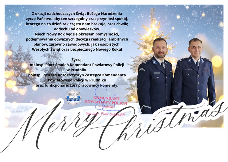 Z okazji Świąt Bożego Narodzenia i Nowego Roku Komendant Powiatowy Policji w Prudniku mł. insp. Piotr Smoleń oraz Pierwszy Zastępca Komendanta Powiatowego Policji w Prudniku podinsp. Ryszard Antoszczyszyn życzą spokojnych Świąt Bożego Narodzenia i pomyślności w nadchodzącym 2026 roku.