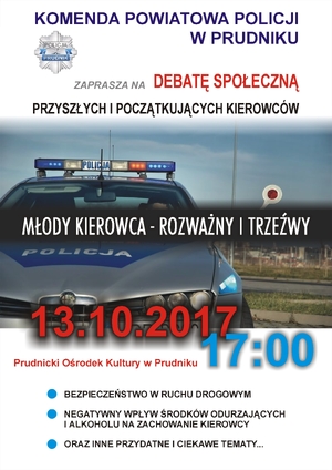 Komendant Powiatowy Policji w Prudniku podinsp. Krzysztof Urban wraz z policjantami serdecznie zapraszają na debatę społeczną pn. ,,MŁODY KIEROWCA - ROZWAŻNY I TRZEŹWY'', która odbędzie się 13 października br. o godz. 17:00 w Prudnikiem Ośrodku Kultury w Prudniku przy ul. Kościuszki 1A.